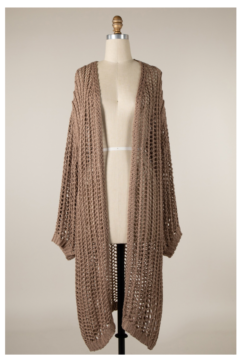 SUPER SOFT CROCHETED KNIT IS THE PERFECT SPRING / SUMMER COVER-UP! THIS MOCHA SHADE LOOKS GREAT WITH EVERYTHING.