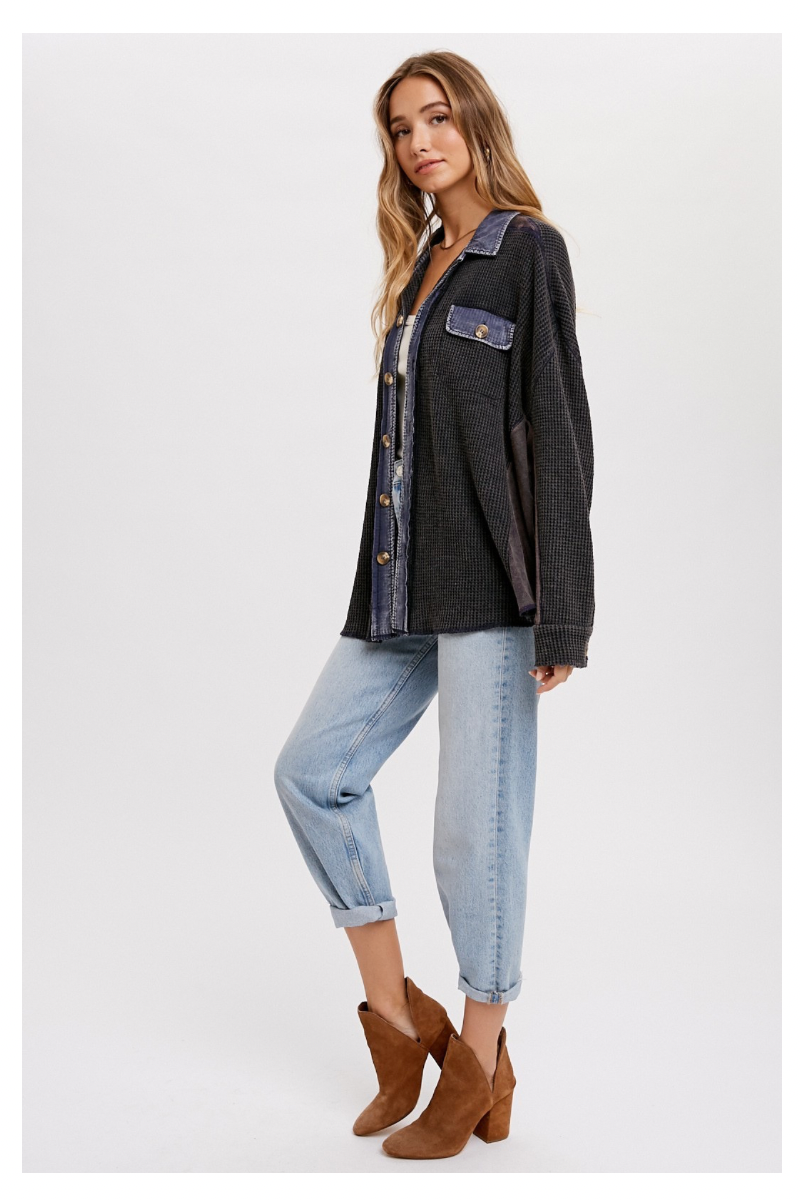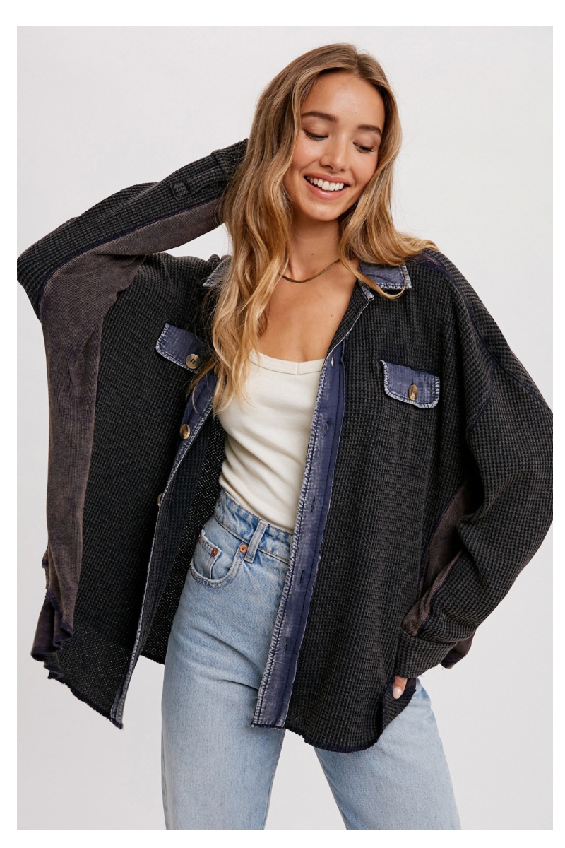 WAFFLE KNIT WITH A POP OF DENIM ADD FLAIR TO YOUR LOOK INSTANTLY!