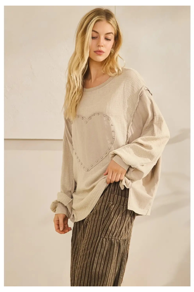 WE LOVE A NEUTRAL PULLOVER WITH A FEW CUTE DETAILS! A STUDDED HEART, YES PLEASE!
