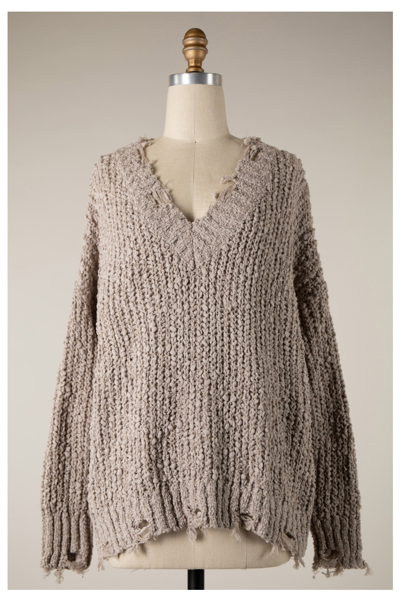 THIS SUPER SOFT SLUB CHENILLE SWEATER HAS AN EDGY VIBE WITH DISTRESSED EDGES! AVAILABLE IN BLACK & TAUPE!